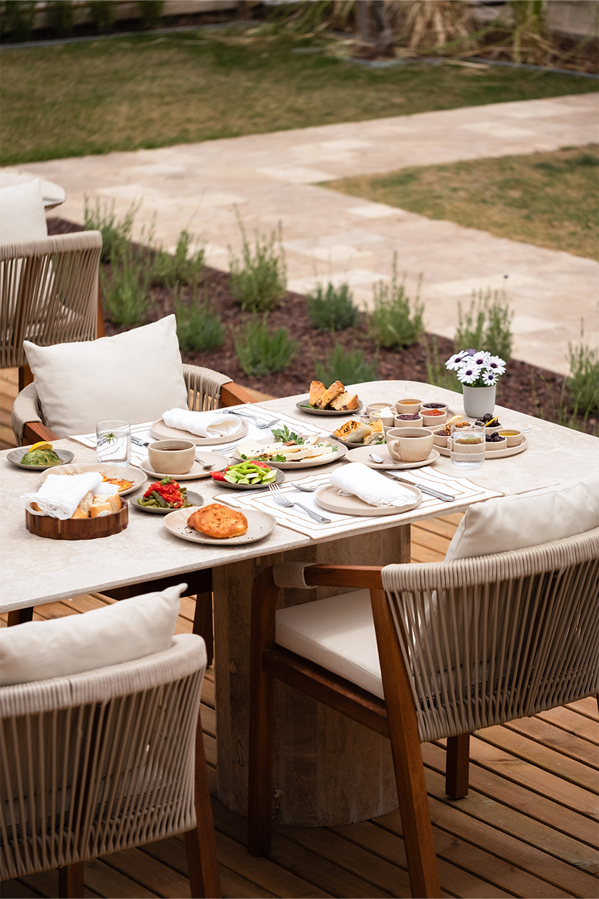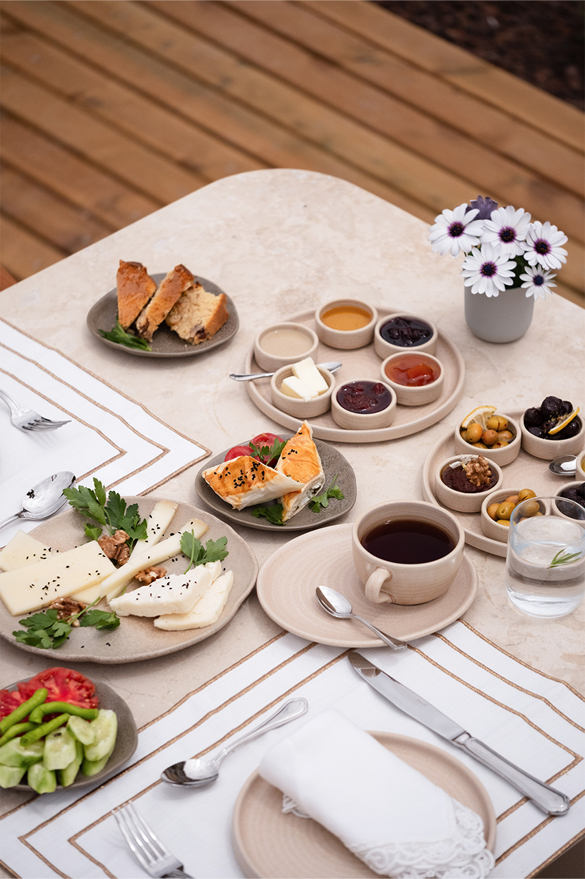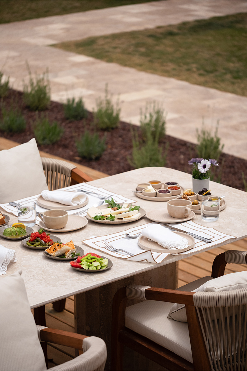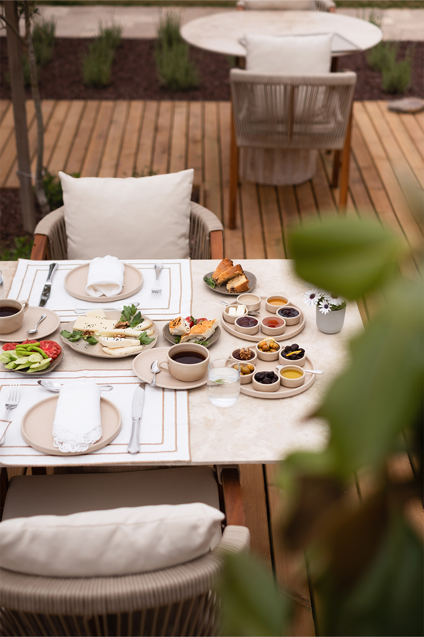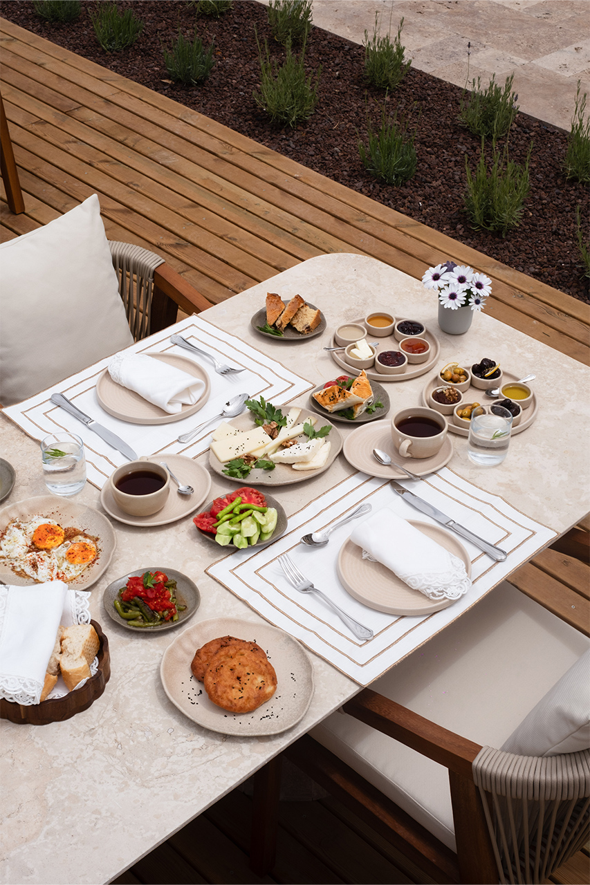 Bahçede kurulan bu sofrada, yerel üreticilerden gelen mevsimlik malzemeler özenle bir araya gelir; her tabakta doğallık ve lezzet kendini hissettirir.